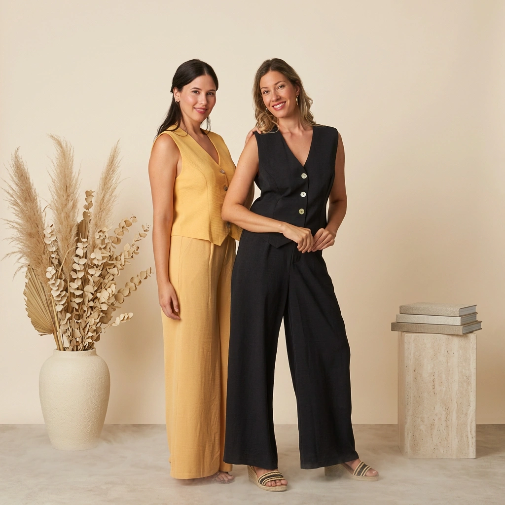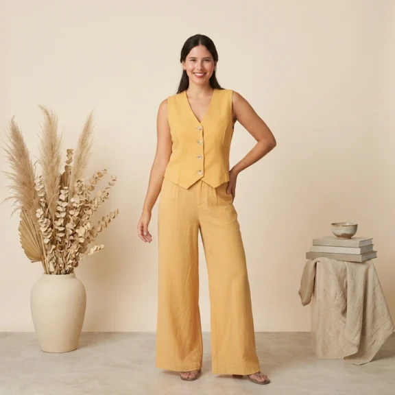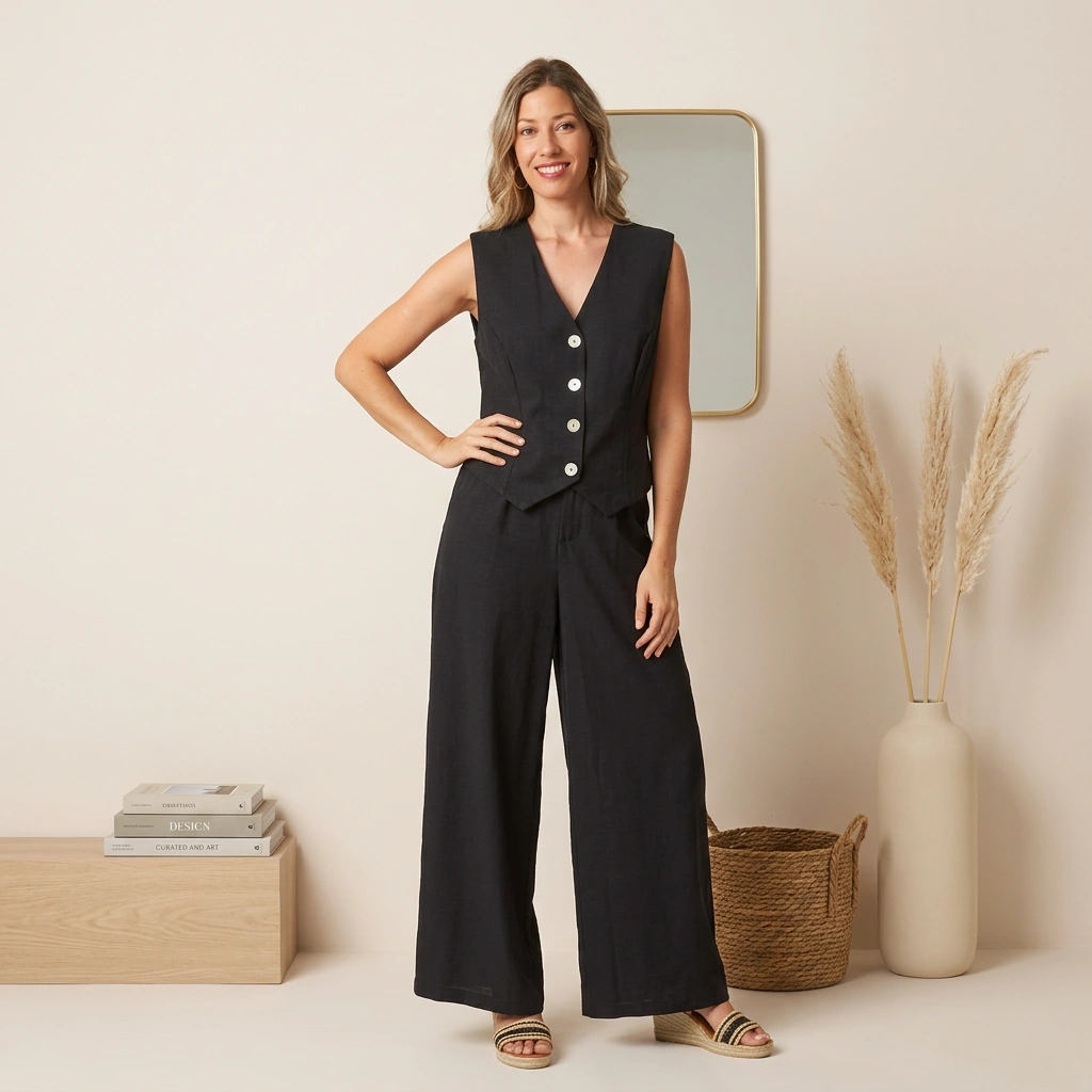 The Aesthetic: This set leans into the “effortless chic” trend, blending professional tailoring with the comfort of breathable, likely linen-blend fabric.