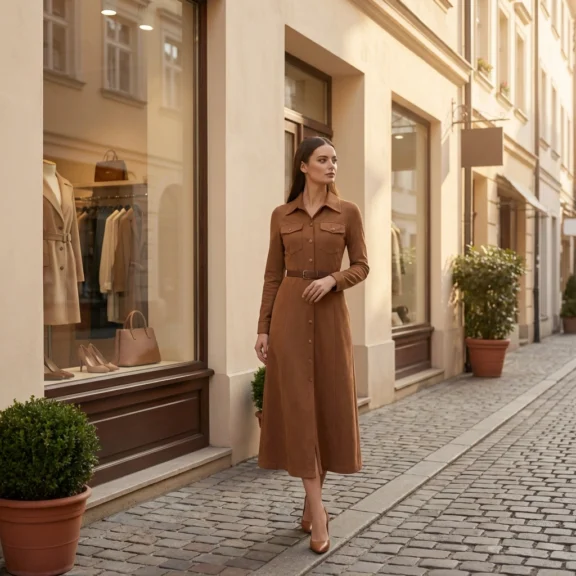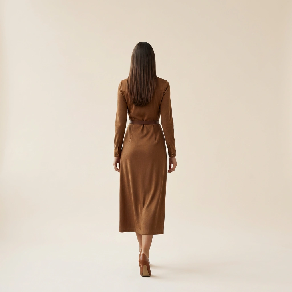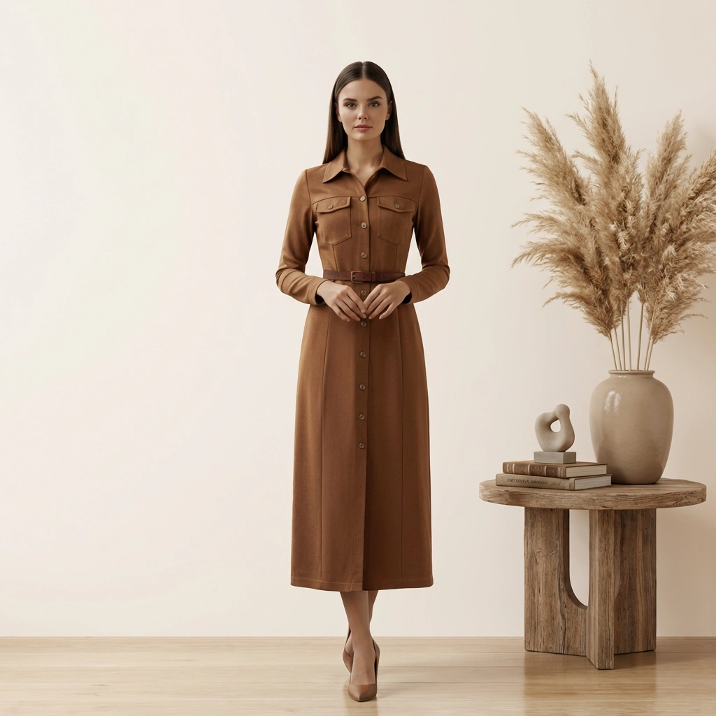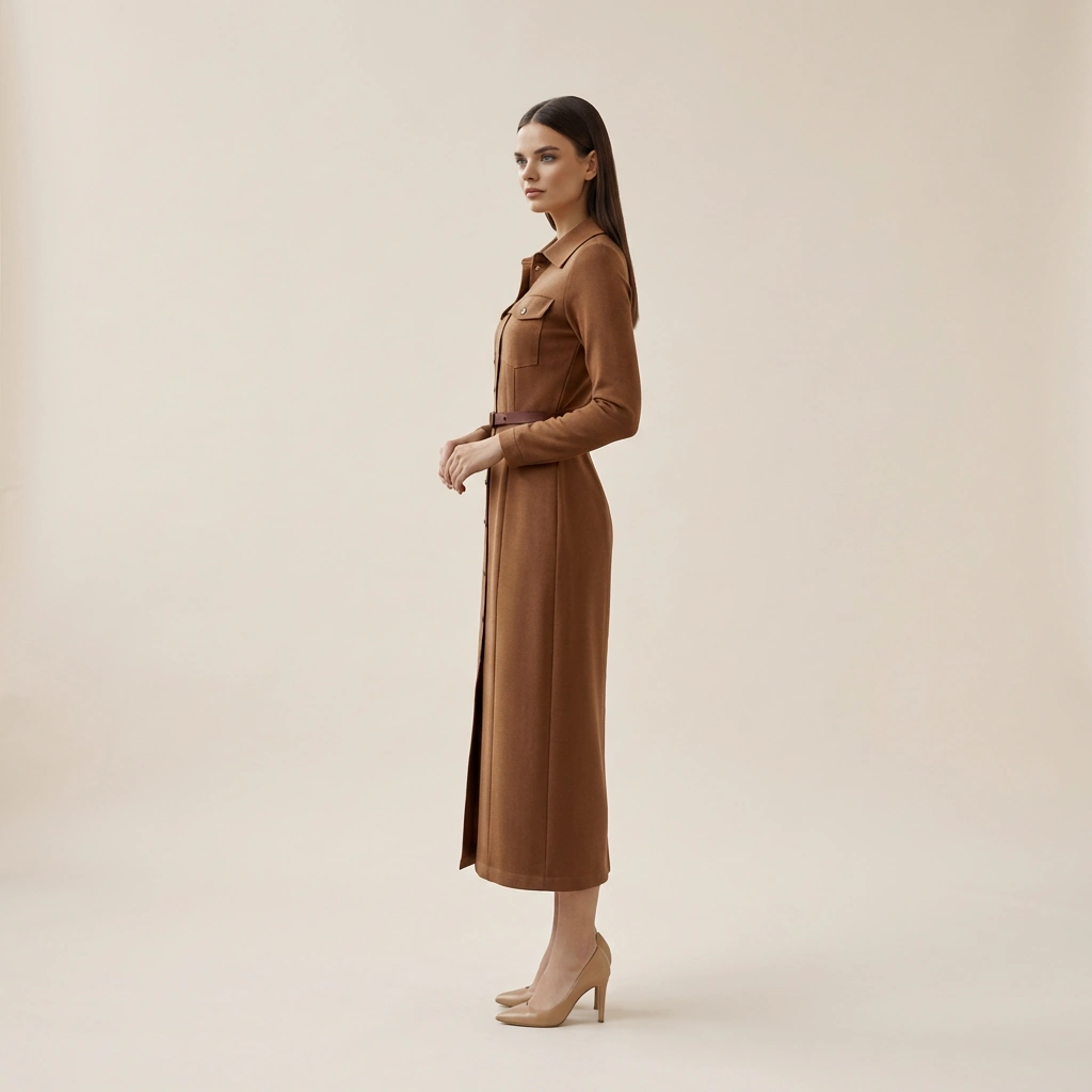 This elegant toffee-toned midi shirtdress is crafted from a soft, matte-finish fabric that offers a structured yet fluid drape. It features a full-length button-down front, a crisp pointed collar, and dual utility-style chest pockets for a touch of modern functionalism. The silhouette is defined by a matching leather-look belt that cinches the waist, flowing into a clean, ankle-grazing hem